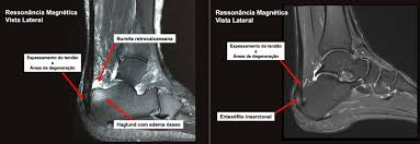 - Aa tendinopatia insercional, aquela que acontece na região onde o tendão se insere no osso e a não insercional, que está relacionada a inflamação e degeneração no corpo do tendão, como mostram as imagens de ressonância magnética na figura abaixo. A tendinopatia insercional tende a ocorrer em pessoas mais ativas