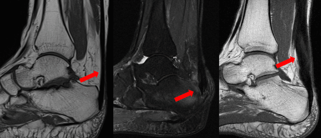 Figura 1: Imagem de ressonância demonstrando da esquerda para a diretia: imagem com tendão normal, imagem com tendinopatia insercional e imagem com tendinopatia no corpo do tendão de aquiles.