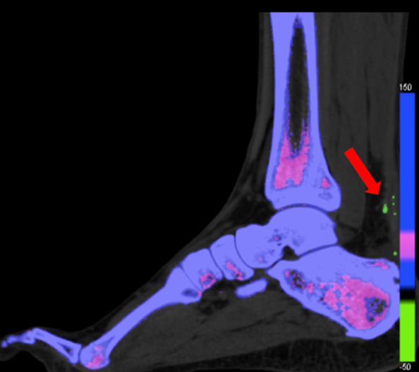 Figura 2: Imagem de TC dupla energia mostrando cristais de gota no tendão de aquiles, em verde, identificado pela seta vermelha.